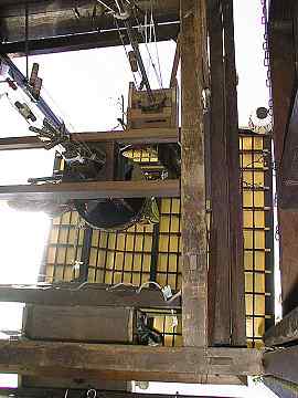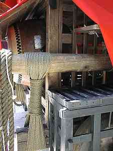 | 上屋根の昇降装置 上部に見えるのがセリアゲ車.綱を引っ張ることににより軽い力で上屋根を上げ下げすることが出来る. |