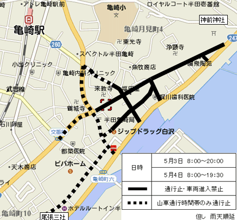 当日は相当数の人出が予想されます.交通事故等危険防止と山車の円滑な運行を図るため、下図のように通行規制が予定されていますのでご注意下さい.