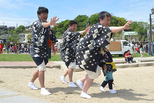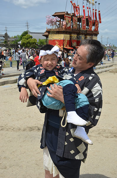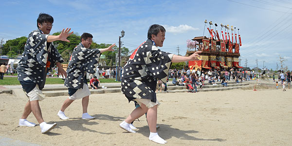 定刻に山車の海浜曳き下ろしが終わり、5輌が浜辺に整列した