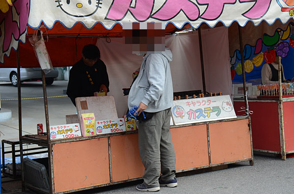 腹にバナナを隠し持ってベビーカステラを買う人物.