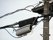 そして、12月のある日ついに我が家に光ケーブルがやってきた. 工事は8時半に始まった.珍しモノ好きゆえ、会社を休んで工事を見物してやろうと思ったが、こちらはまだ寝起き.いきなりフェイントをかけられてしまった 思った通り写真Aのクロージャーにハシゴをかけ分岐してから、既存の電話線に沿って自宅前の道路まで引っ張ってくる.この間30分位か. そして道路をまたいで数10mの空中を飛ばして我が家の2階外壁へ固定する.ケーブルを触らせてもらったが思ったより細い.聞けば被覆内のファイバーは更に細く0.25mmとの事.よくわからないが凄い.角度を付けて曲げると折れてしまうので、写真Cのように角は緩やかに曲げる. 設置する部屋の外まできたら、キャビネット(PD)を設置する.ここで室外用の黒い光ケーブルと、室内用のクリーム色の光ケーブルを接続しているのだ. つまり、50m先のクロージャーからここまでは分岐などなく1本の光ケーブルが続いていることになる.そしてこの近辺ではまだだれも光を導入していないとのこと. 室内への引き込みはエアコンのダクト穴などを利用するらしいのだが、運悪く位置が悪くて、壁に穴を開ける事を許す. 建物に配管工事がしてあれば、外壁をぞろぞろ這わせたり穴を開けるみっともない事をしなくてもいいのだが、行き当たりばったりのnova人生ゆえ、こんなものである. キャビネット近くから室内に入ったケーブルは5mほど壁を伝って、回線終端装置(ONU)に結線される.光の結線は素人には手に負えないので、余線をお願いすると、渋々3mほどクルクル巻いて残してくれた. これで、将来パソコンの位置を変えたくなっても、移動が可能になるわけだ.だが、後でよく考えたらLANケーブルで調節すればいいのだから無意味だったかもしれない. ここまでで一通りの工事終了.持参したノートパソコンと終端装置をLANケーブルで接続して局と連絡しながら何やら計測.意味不明だが-26.12dBとか言ってるが、とりあえずは私には関係なさそうだ. そして「90メガ」の声に、私は眼を輝かしたが、NTT局とのスループットだそうな.実際の回線速度とは違うらしいが、100MのFTTHで90Mならと何となく納得. これにてFTTHの開通工事完了.この時点で11時30分だから丁度3時間の工事時間だった. 以下次回 |