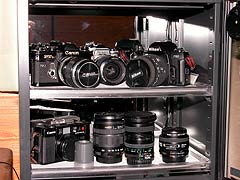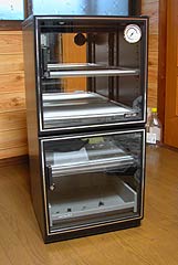 例年になく気合いの入った梅雨である.洗濯物が乾かないとお母様方もさぞお困りであろう.我が家でも、書斎兼資料室兼がらくた部屋がいつの間にか半乾きの洗濯物で一杯になることがある. 湿っぽくて厭なのだが、強く言えないのがつらいところである.多少なら我慢するのだが、今年のように雨の日が多いと、その衣類乾燥室に入るのも大変である. 実はその部屋にはカメラ機材も収納している.レンズは湿気が多いとカビが生える.だからカメラは湿気が大敵なのだ. カメラ本体とレンズは樹脂製の密閉容器に乾燥剤を入れて保管しているのだが、出し入れが頻繁なのか、すぐに乾燥剤がシケってしまう.シリカゲルだから電子レンジでチンすれば再利用出来るのだが、面倒である. そんなある日仕事の帰りにカメラ店に寄った.やはりシトシト雨の降る日だったが、お目当ては超音波モーターと手ぶれ補正の付いた、少々お値段の豪華な新製品の交換レンズ. しばらくウインドウに飾ってあるレンズを見ながら、我が懐具合をシミュレーションしてみたが結論は出ず.まあ慌てずともよい.秋祭りに前に合えばということにして.... 帰ろうとしてふと目にとまったのが防湿庫.こっちは決断が早かった.一眼レフなら24台収納出来るタイプ.もちろんそんなにカメラを収集する趣味は持ち合わせていないが、小さいより大きい方がよかろう.(買いに行ったものを買わずに別な物を買ってしまうのはいつもの事.病気ではないと思うのだが) さっそく機材を入れてみたが、奥のミラーと内部照明でショーケースのようである.なかなかキレイで気に入ってしまったので、くだんの衣類乾燥室から居間に置き場所を変更することに..... カミサンの目は「またそんなものを買って....」と言っているようだ.やはり大きな物は目立つので要注意.カメラやレンズなら買い換えても、決して気づかれないのだが. 食器乾燥機がどうだとか、後ろで言ってるが聞こえないふりである. 説明書によるとカメラの保管は30〜50%の湿度が最適だそうな.乾燥しすぎるのは油切れを起こすので逆によくないそうだ.