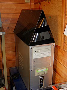 前回の続編である.この物体は写真のようにパソコン本体の上に載せるものだ.いわばパソコンの屋根なのだが、勘違いしないでいただきたいのはnova家が雨漏りするからではない.冗談でクイズと書いたら、ホントに応募があったのには驚いたのだが、そのなかに『弓射り人形の的』という素晴らしい解答があった. 的に矢が当たったらあの三角からネコを出すのではないかと....まさか(^_^;) 他にも山車模型の一部という答えもあったが、私も最初それは考えないでもなかった.どうせパソコンの屋根にするなら唐破風にして山車っぽくしようかと. だが、一旦そうしてしまうと私の性格として、次はパソコンに赤い幕やら車輪やら、あげくは人形まで載せなくては気が済まなくなるだろう. 考えただけでとても使いづらいパソコンになるのは目に見えているし、第一あの唐破風の加工が面倒だろう. そして、そもそも屋根の傾斜が急でないと当初の目的(用途)を満足出来ないのだ. |