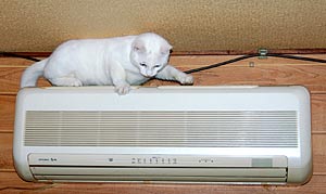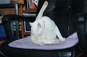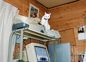 もったいぶらずに、ここらで種明かししてしまおうか. 実はこれ『ネコ排除装置』なのである. ごらんのように、我が「こじろ〜」は普段は私のパソコン用椅子をソファー兼寝床としておる.私がパソコンに向かうときには、最大限の敬意を表して遷座願うのだが、この際必ず我が腕を一噛みしてくれる. そうすると、しばらくはモニター上部の棚にあるスキャナやプリンタの上で私の作業を監視したり、それも飽きると頭上にあるエアコンの上で何やらゴソゴソしているのだ. そして忘れた頃にやってくる恐怖が、『頭上ダイブ(別名パンチー・ジャンプ)』である.パソコンに熱中している私めがけてダイビングし、ネコパンチを一発かまして一目散に逃げていくのだが、これはホントにスリリングである.冗談ではなく心臓が止まりそうになる. 初めてエアコン上からダイブされたときは何事が起きたかと....... まあ、それはよい.私が我慢すればいいのだから(^_^;) 我慢ならないのは、棚やエアコンに登るアプローチにパソコン本体が踏み台代わりにキックされること.上に積んであるCDやら小物がバラバラ落ちてくるのもまだいいのだが、パソコンがグラグラするから、HDDは多分軽い脳震盪くらい起こしているのではないだろうか. 『ネコに説教』ということわざを創作したくなるほど、何度言い聞かせても無駄であった. そのうちHDDがクラッシュするのが目に見えているからして、無い知恵を絞って対策を施したのが、この黒い三角の屋根なのだ. 設置直後は予想通り効果てきめんであったが、しばらくして三角の中でこじろ〜が爆睡しているのを見つけたときは、目が点になった. そして、再度対策を施したのが現在形である、といっても単に透明テープの粘着側を表向きに貼り付けただけだが、テープのベタベタが苦手らしい いまのところ安泰だが、いずれ唐破風赤幕仕様のパソコンも悪くないかなと..... |