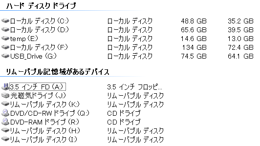| 相変わらずマイコンピュータは賑やかだ.120GBを分割して50GBをWindowsシステム用(C)に、データ用(D)は60GB.150GBのHDDはスワップファイルやアプリのワークエリア(E)として15G確保.残り(F)はすべて画像データ用.これで当分の間画像CD-RやDVD-Rをいちいちセットしなくてよい. Gドライブは外付けのUSBドライブでバックアップ用とDVDを焼くためのワーク領域に. 以下J:外付けMOドライブ、K:内蔵CFカードリーダー、Q:DVDコンボドライブ、R:DVDスーパーマルチドライブ、H:USBのCDカードリーダー、I:USBのSDカードリーダーとなるが、我ながらよく考えてファイル操作しないと間違えそうである...... |