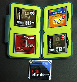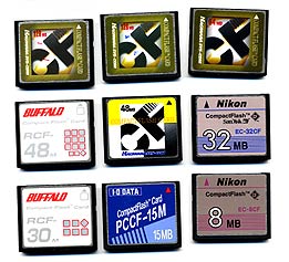 だが、小銭ならまだ使えるだけいいのかもしれない.右は一昨年の3月(平成15年)のこのコーナーで使用した当時所持していたデジカメ用の全メモリカードだが、9枚合計でたった500Mである.
