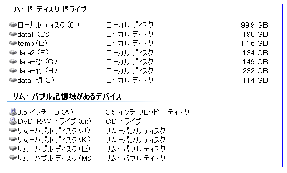 バックアップもせずそのまま移し替えたけだから、以前のデータはそのまま残っている.(data松、竹、梅がHDDケースにあるドライブだ) パソコンの電源オン/オフに連動するので、手間がかからないし、USBだから必要な時に電源を入れても途中で切っても構わない. 案外使い勝手は良いようだ. と、思ったのだが......