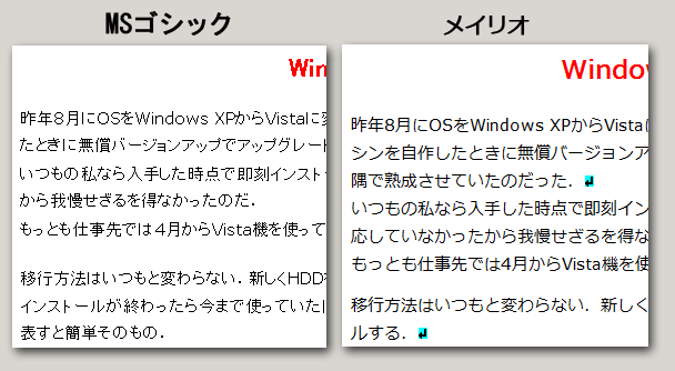 例のように『メイリオ』と『MSゴシック』では文字の大きさや間隔が随分違うから、レイアウトも狂ってしまうことになる.