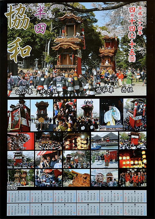 半田市協和地区の祭礼ポスターです.今年は秋に『はんだ山車まつり』が開催されることもあり、地元だけでなく半田市全体の祭りを盛り上げようと、今年初めて協和地区のポスターが作られました. 白山神社境内での砂子組白山車と西組協和車の写真をメインに、両車の祭りの様子や彫刻の写真の他、下段に今年のカレンダーを配し、ポスターだけでなく平成24年のカレンダーとして利用出来るデザインとなっています. 地元の商店街を中心に配付されましたが、希望者には1枚300円で頒布しますとのこと.