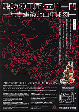 <企画展パンフレットより>立川和四郎冨棟を初代とする諏訪の立川一門は、江戸時代後期から宮大工・彫師として飛躍的に発展し、諏訪を拠点として中部地方や東海地方などを中心に多くの優れた作品を残してきました.