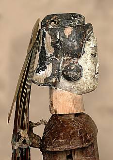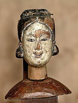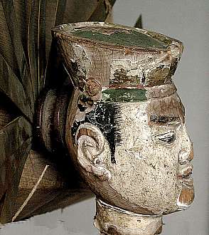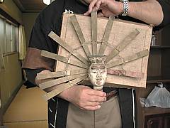 頭は,いずれも大人の拳くらいの大きさで,牽牛(らしき)人形は首から上,織女(らしき)人形は肩から上が残されていました.首は前後には可動しません(うなずかない).後光は真鍮の板で出来ており,中心を後頭部に固定してあります.また中間部に開けられた穴に通した糸で,等間隔に開くようになります. |