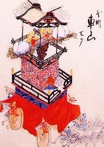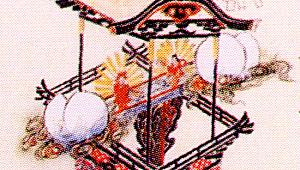 絵図には,車山の三層から左右に張り出した出樋に,真ん中から割れた丸い作り物(星か?)が二つ.そしてその内側に,金色の光背(後光か?)を背負った人形が二体見えます.傍らには『七夕』と書かれています. 七夕のからくりであれば,絵図の二体はおそらく牽牛と織女なのでしょう. この人形が先程外町で見た人形に,よく似ているのです.特徴ある後光らしきものも双方の人形にあります.また風貌もそれとおぼしき男女なので,断定は出来ませんが,これを牽牛・織女と推定するに十分かと思われます. 七夕はご存じ,年に一度七月七日の七夕に出会う牽牛・織女の物語ですが,この寛政の絵図にある七夕のからくりが,どのようなもので有ったかは知りません. 絵図から推定する限りでは,車山の外に張り出した左右の星が割れて,中から牽牛・織女が現れ,出会うようなものなのでしょう. 現在,外町のからくりは「梅梢戯」という梅の梢で倒立する唐子で,これは文政10年(1827)に玉屋庄兵衛によって作られたものです. |