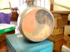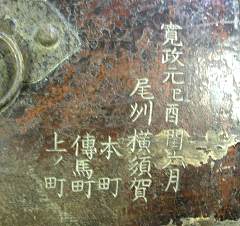 | 古い太鼓.寛政元年(1789)とあることから,現在の山車が出来る以前からのもの. 右の「傳馬町」は,現在の東海銀行から同盟書林にかけての一帯. |