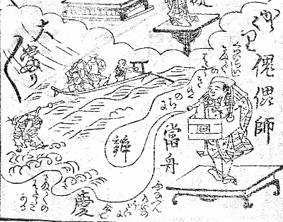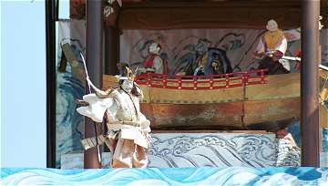 | 義経と弁慶一行の乗った船や亡霊として現れた知盛も,劇中劇として同じように描かれている. | ![]() |