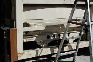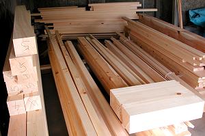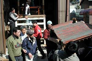 | 田古屋「宮本車」に続き,廻間組の山車を旧来の姿に戻す修復作業が始まりました.当日は現車から使用できる部材を取り外す作業と同時に,昨日搬入された資材も加工が始まっていました. | |