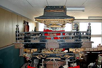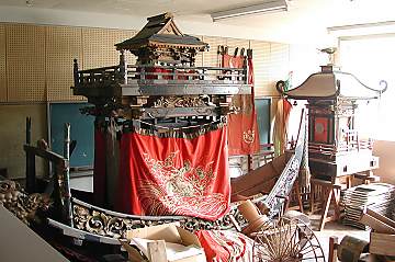 | これは,お隣南知多町の郷土資料館に保管(展示ではない)されている船山車. 明治7年(1874)豊浜中州区建造の山車で,後に半月区に譲渡され,昭和47年まで曳かれていました. 山車の状態は良くないです. (窓越しからの無許可撮影です.問題ないと思いますが.....) |