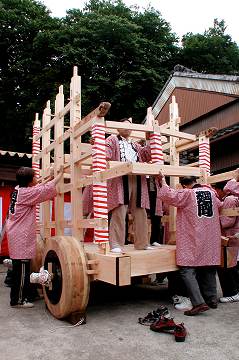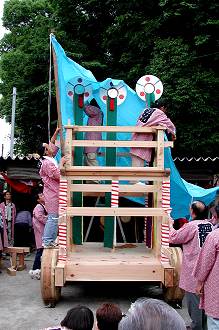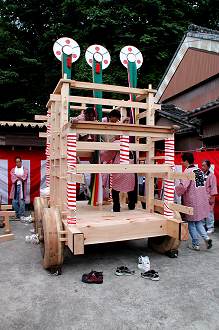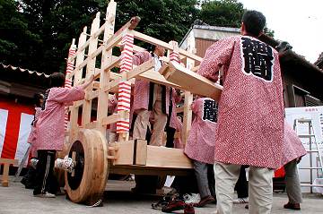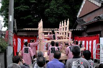 | 今年3月より「廻間山車復元の会」により行われていた山車の建造(改修)も,無事棟上を迎えました. 地区の皆さんも多く集まり,無事終了.......したと思いますが,突然の雨で逃げ出してしまいました.(尻切れのトピックスになり,申し訳ありません) |