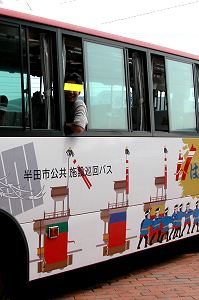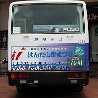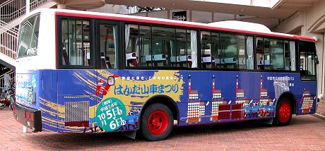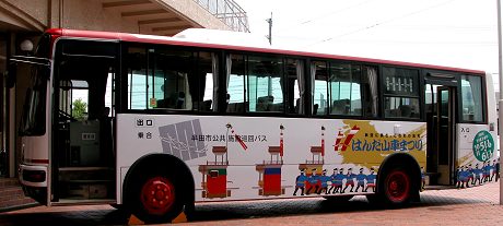半田市内の公共施設を結ぶバスが「はんだ山車まつり」のPR用を兼ねて,7/21から市内を循環します.左側面を昼,右側面を夜祭りにデザインされたラッピングバスの車内ではお囃子が流れ,ムードを盛り上げます.