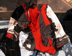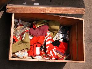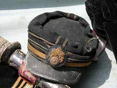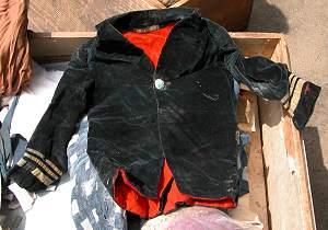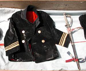 | 公通組の旧前人形が着ていた官員さんの制服と刀. 右は一番古そうな服でボロボロ. 下はシングルボタンの官員服. 晩年に着ていたと思われるのが右下のダブルの制服. サーベルもあった. |