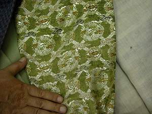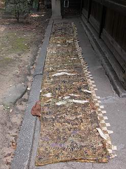 | 右は大門組先代の水引幕. 上から紺の布を縫いつけてある(これは1年だけ使用) ほどくと見覚えのある黄緑地の西陣織が現れる. |