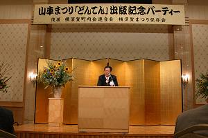 | 「どんてん」出版記念パーティ 横須賀まつり保存会の森俊夫氏がこのたび『我が町我が故里のまつり どんてん』を自費出版されました. その記念パーティが金山の全日空ホテルグランコート名古屋にて九代目玉屋庄兵衛師,東海市長,犬山市長はじめ多くの参加者を集め催されました. |