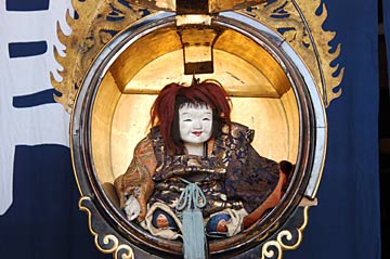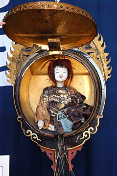 | 龍神唐子と龍神太鼓の里帰り 名古屋市東区出来町の中之切には文政4年尾張10代藩主斉朝公から御庭車を拝領したという言い伝えがあり、これが戦前まで当地の天王祭で曳かれていた「石橋車」です. この「石橋車」は惜しくも戦災で消失し、戦後中区住吉町から「河水車」を購入しました. からくり人形は能楽の「石橋」に由来する旧来から中之切に伝わるからくりです. 今回中之切山車保管庫(山車蔵)で披露されたのは旧「河水車」のからくりで、名古屋市博物館で展示保管されていますが、関係者の尽力で25年振りに里帰りしたものです. |