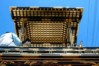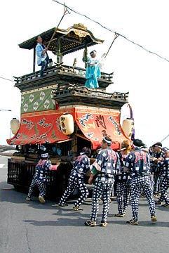 | 西枇杷島まつりの問屋町「振陽車(頼朝車)」の漆塗替え・錺金具の修復が行われ、6月5・6日の西枇杷島まつりには面目を一新した振陽車がお目見えしました. なお、本楽祭用の蝙蝠の幕を土曜日に使用していたの珍しいこと.(日曜日は試楽祭用の幕だった) |