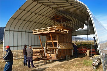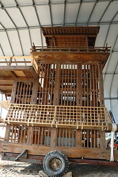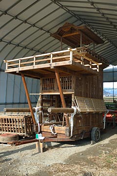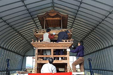 | 山車は以前から解体されてままになっていたが、地元の手によって組立てられ農機具置き場に保管されている. 風雨にさらされ山車の保管には適さず恒久的な保管施設が必要でしょう. |