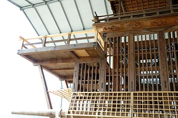 | 平成18年1月15日、愛知山車祭り研究会の会員が当地を訪れ、上町の山車の復元作業にあたりました. 高須は揖斐川と長良川に囲まれた高須輪中にあり、江戸時代の美濃高須藩は尾張藩の支藩ともいえる間柄で、幕末には尾張藩主徳川慶勝や会津藩主松平容保らを輩出しています. 海津市の指定文化財には明治時代に建造された本町や末広町の山車が指定されています.(上町の山車は未指定) 現在祭礼には山車は曳き出されていないようです. |