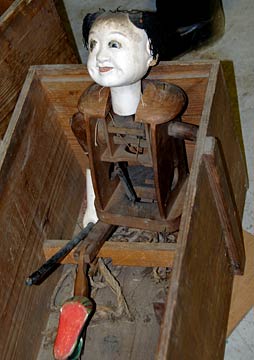 | 海津歴史民俗資料館に上町のからくり人形が保管されていました. 人形は3体で、采振り人形の唐子1体と恵比寿・大黒の二福神のからくりと思われます. 恵比寿大黒の二福神からくりは各地にありますが、当地の人形は面被りで恵比寿人形になる珍しいからくりです. |
