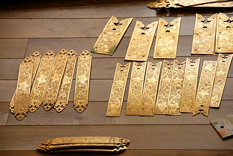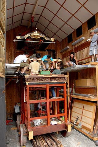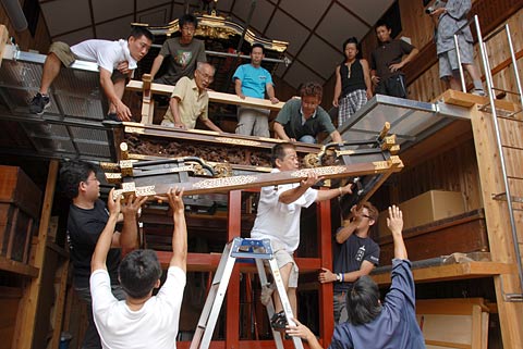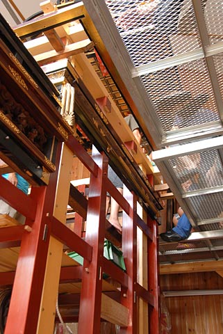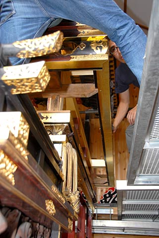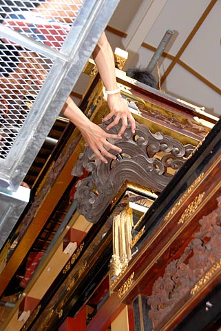 ![]() いよいよ大物彫刻の取り付け. 順番を間違えると組めないそうで、まずは前の左右端から. |
