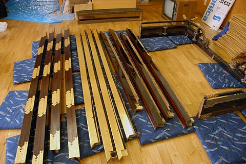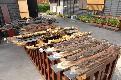 ![]() 漆塗りが仕上がった高欄廻りの部材 |