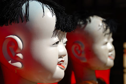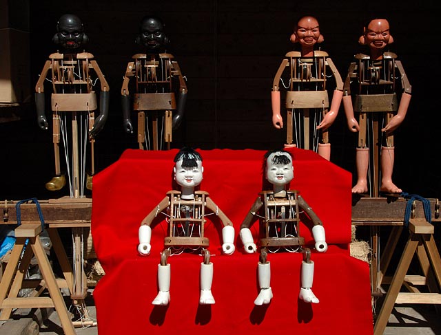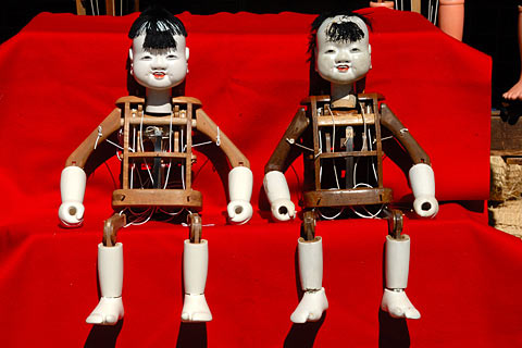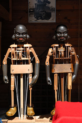 | かねてより製作中だった采振人形(前人形)が復元新調され、このたび町内でお披露目が行われました. 先年復元新調された恵比寿・大黒人形と同じく大垣の人形師後藤大秀師による製作で、並べて見比べても相違は見いだせないほどです. ただ、新しい人形は顔が汚れていないせいでしょうか、いたずらっ子がお坊ちゃまになったような.... この人形は10月14日の花車神明社例祭と翌15日の名古屋まつり山車揃えで登場です. |