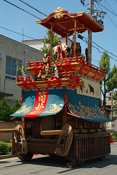 湯取車は万治元年(1658)に桑名町(現名古屋市中区)で建造された東照宮祭の祭車「湯取神子車」の古車を譲り受けたもので、この三色縦継ぎ幕は文化12年からとされています.