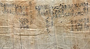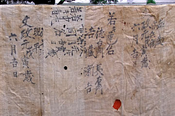 また左側面の裏地にも40名ほどの人名が墨書きされていますが、いずれの幕も裏地の墨書きが入れ違っていたり縦横が違っており、一旦解きほどかれ、再び縫い合わされた形跡があります.