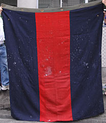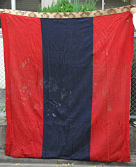 | 左側面 両端の緑布と中央の青布は同寸の2枚の布が縫い合わされて構成されている. 右の赤布は中央寄りに別布が10数センチ加えられている. |