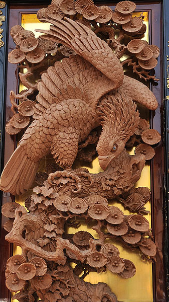 山車前方左右に飾られる「松鷲」の彫刻は高さ120cm、幅50cm、厚さ20cmの大きな作品で、ケヤキの1枚板に彫刻が施されています.