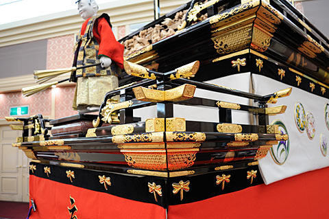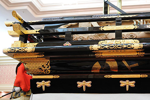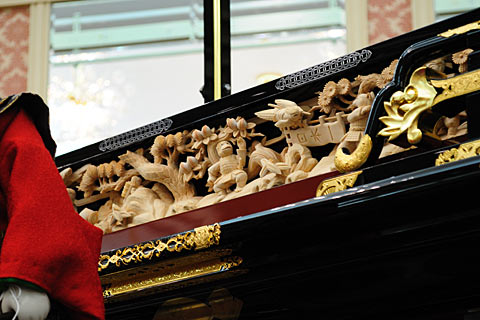 空木立ち、彫刻、漆塗り、金箔、彩色、蒔絵、錺金具などすべて会員の手によって作られ、楫方組織二番永田組とからくり人形は二代目萬屋仁兵衛の協力によって完成しました.