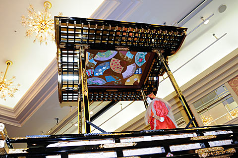 また童子車のお囃子は門池氏によって編曲、同氏と二番永田組が実際に童子車に搭乗して演奏.人形制作者の萬屋仁兵衛氏も山車に乗り、からくりを操作しながらパーティ会場を実際に曳かれました.(次ページ動画を参照)