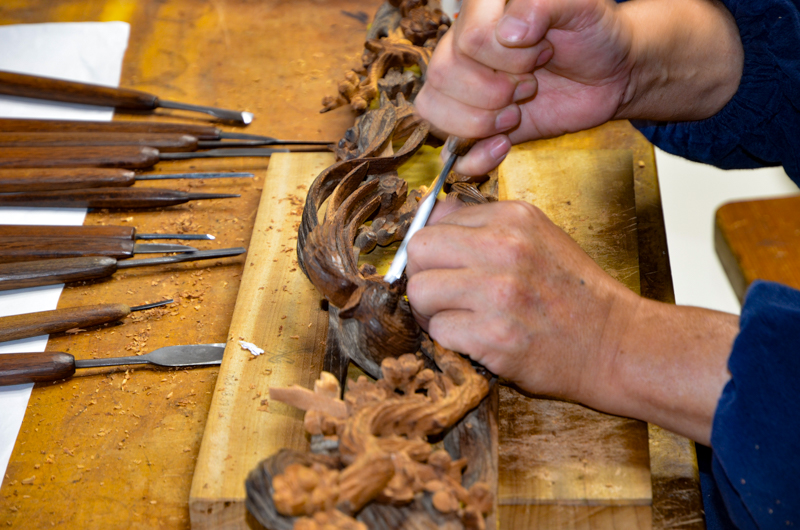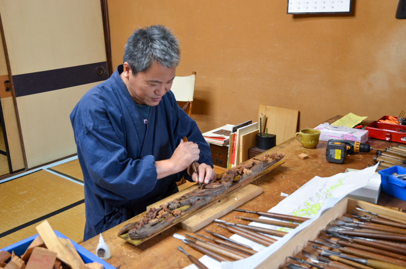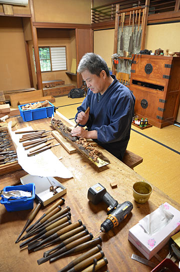 平成23年6月より半田市亀崎に逗留し、同中切組「力神車」の彫刻修復を手がけられている有馬白匠要治師.