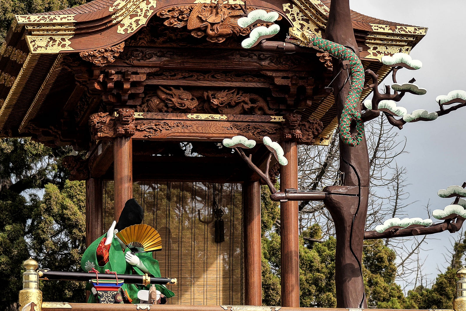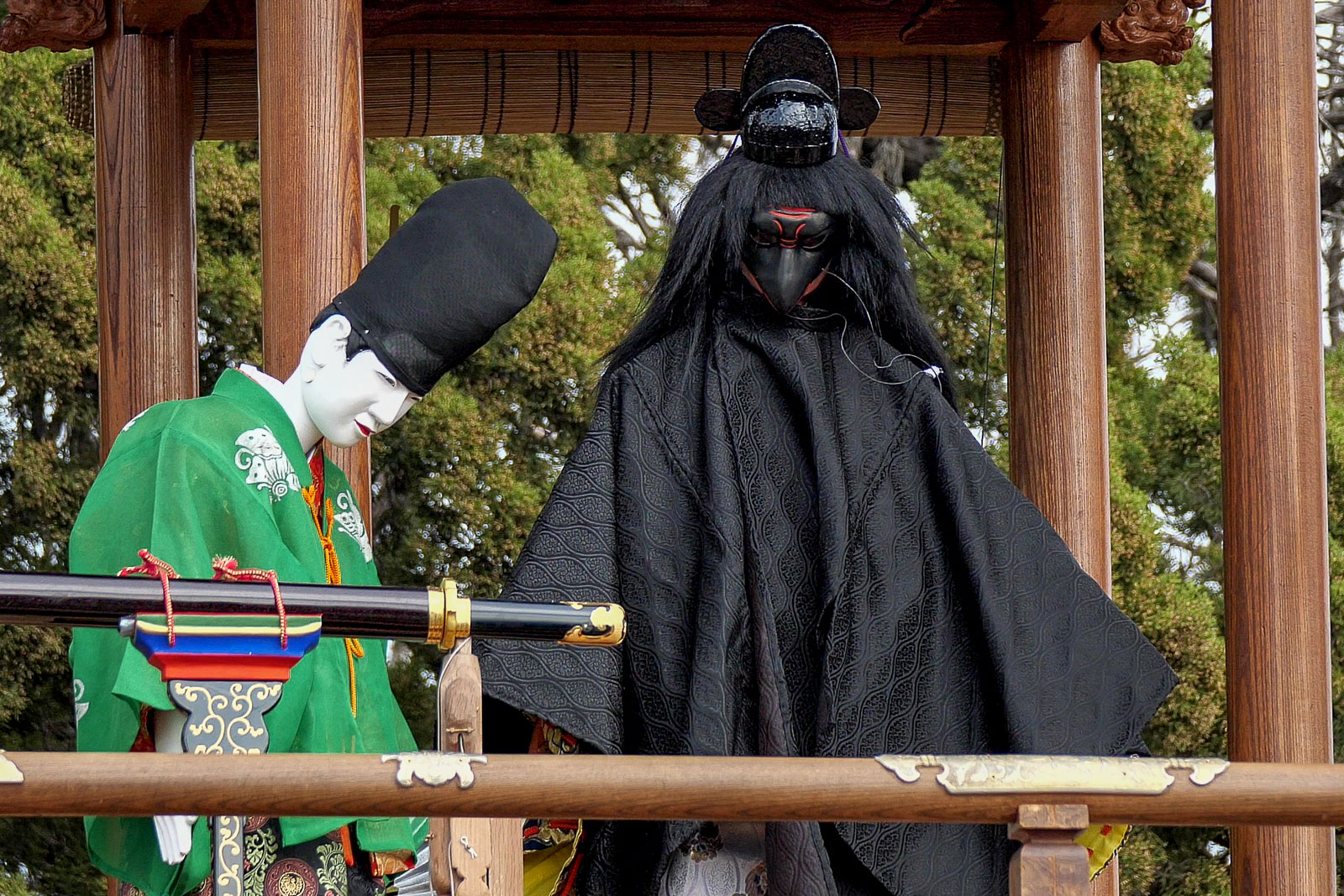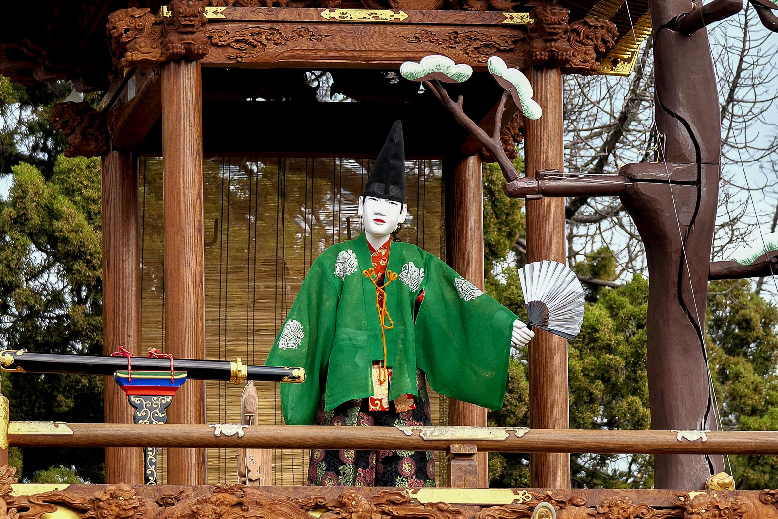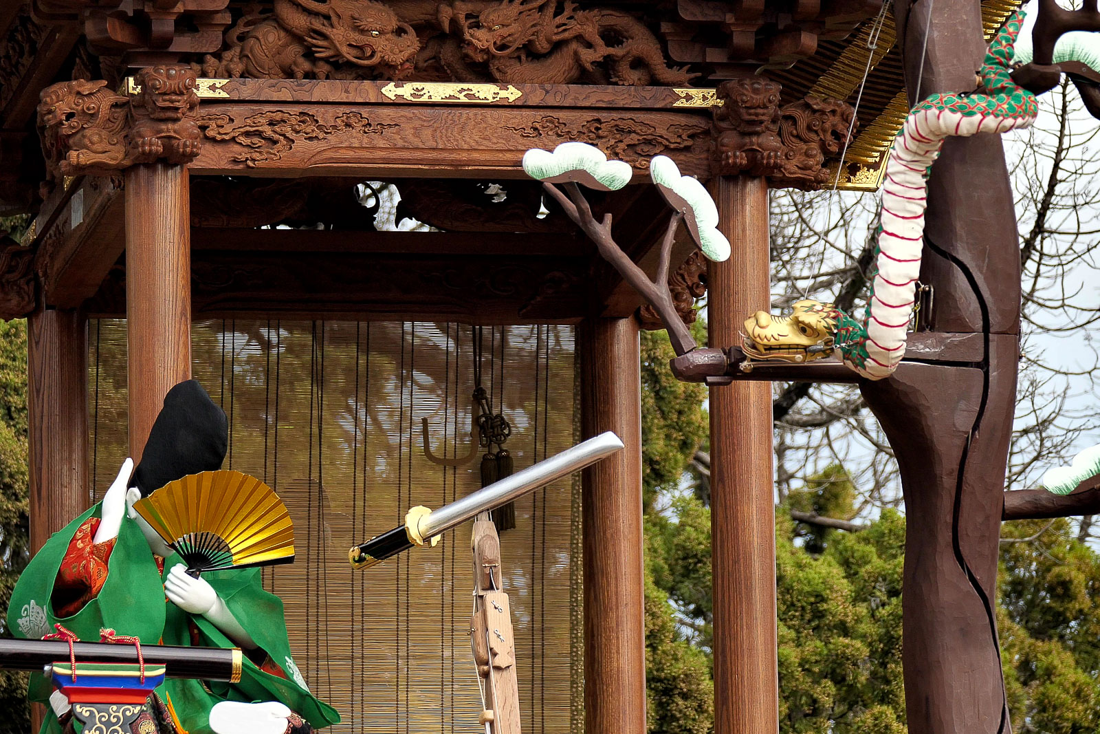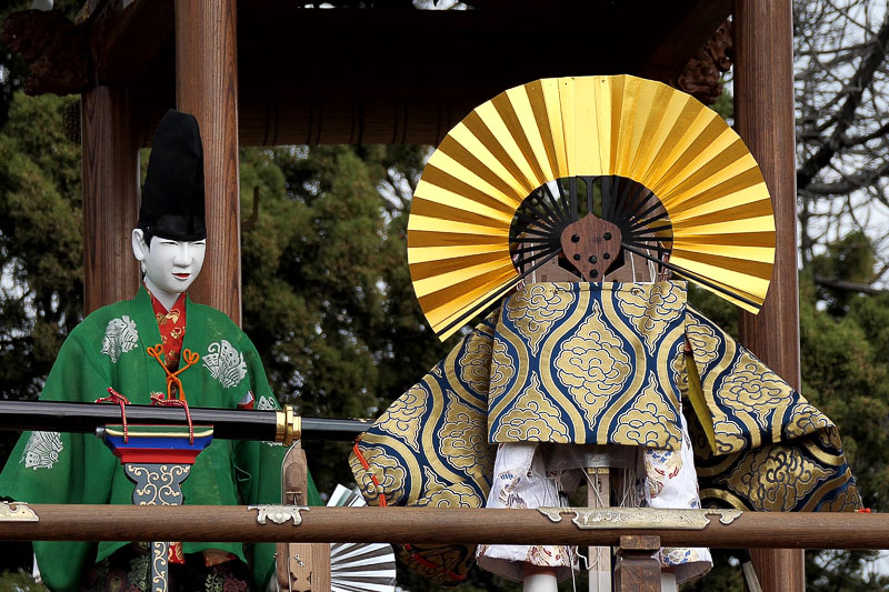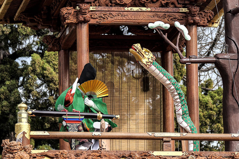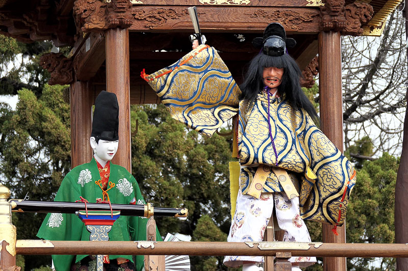 からくりは平忠盛、八咫烏(やたがらす)の二体の人形と、さらに神剣「小烏丸(こがらすまる)」と大蛇によって演じられ、上山には大蛇が昇降する木が据えられます。