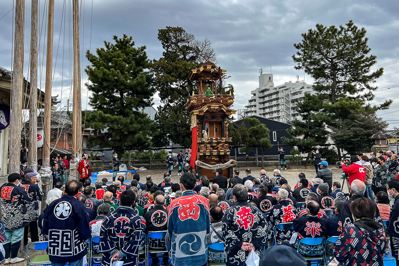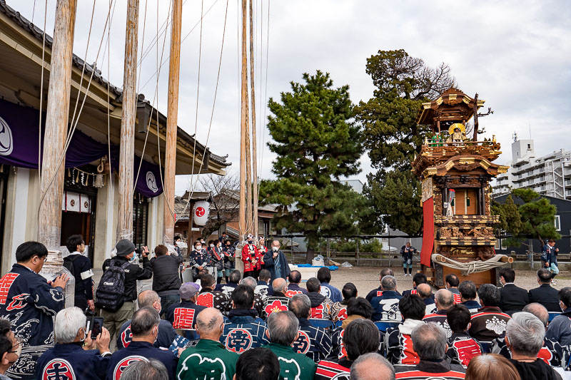 八幡社の坂を上がった宮本車は境内に据えられ、半田市内各山車組来賓者が見守ります