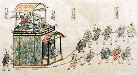 一方宝暦5年(1755)の「乙川祭礼絵図」には4輌の山車にそれぞれからくり人形が描かれており、先頭の浅井山の上山には2体の人形が描かれ、その注釈から「小烏丸夢之助太刀」人形が載っていたことがわかります。