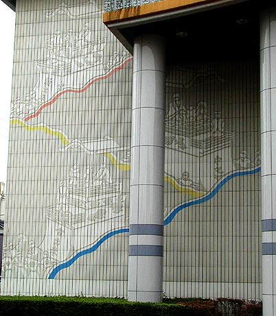 | 名古屋市立明倫小学校.明治6年の開校というから、名古屋市内でも数少ない130年もの歴史をもつ小学校である.今は児童数250人というから1学年1〜2クラスだろうか. 玄関は古代ギリシャ神殿を彷彿させる立派な校舎で、その玄関脇の壁にタイルで描いた壁画が上の画像だ. 学区内の西之切「鹿子神車」、中之切「河水車」、古出来町「王羲之車」を見事に再現している. 水引幕やからくり人形などにもこだわりをもってデザインされたものだ. この壁画を毎日見ながら登校する児童たちよ健やかに育て! 6月の天王祭には3台の山車がこの小学校に立ち寄り、玄関前で1台ずつからくりを奉納するのが恒例になっている.まさに地域と一体になった祭りなのだ. この壁画だが、実に撮りづらい被写体だ.モノトーンで明暗差がないので単なる灰色の壁に見えてしまう. やむなく今回は画像処理で強調したのだが、機会があったら是非実物を見ていただきたい. |