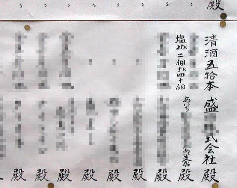 | 色んな祝儀があるものです.閑なときは、貼りだした祝儀を眺めます. 特にこのコーナーがネタ切れだったりしたら、目を皿に、更に... この日の収穫はこれでした(^_^;) 実は前回のアングルは今回のため導入部(^_^;) 海老紙ではなく、祝儀をこのように掲示するところもあるのだ. 「清酒五拾本」......(^_^) なかなか豪気である.私などこの文字を見ただけで酔っぱらってしまいそうである. モザイクを掛けたが、多分わかってしまうだろうか(^_^;) 「清酒五拾本」の隣は塩250Kg. これも豪快だ.ナメクジなら卒倒しそうな数字だろうて...... |