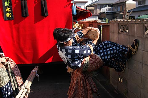 狭い道ゆえ山車がブロック塀に衝突しないための重要任務なのだから.