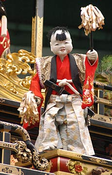 | 名古屋系の山車の前棚で采や御幣を振る人形を采振り人形という.いや正確には采を振るのは「采振人形」で、弊を持つのが「弊振人形」と云わねばならんだろうか. 面倒だから、私などは全部「前人形」と呼んでいる. 上の写真で左が犬山の余坂「宝袋」の弊振りだが、少しばかり顔色が悪いのが気になる.ひどくならないうちに医者に行った方が....おっとこれは余談(^_^;) 右が采振りで、これは中村の二福神車の人形.采振人形は愛嬌のあるお侍さんか唐子が多いが、なかには不機嫌そうなヤツもいる. かと思えば、横須賀の大門組や常滑の小倉車のように前人形の載っていない山車もある. 先日画期的な前人形を見つけたのだが、万博も近いことでもあり、前人形の無い山車は検討願いたいものである. これから述べる特徴を頭に思い描いていただきたい.想像力のある皆様方なたたやすいこと. ・下から糸で操作しなくてもいい.自動で動くからくり人形である.いわゆる西洋からくり(オートマタ)とでも云おうか.万博で来日する外人さんにも馴染みやすかろうと思う. ・右手は采ではなく旗を持って上下に振る.しかも旗は黄色である. ・左手は提灯だがロウソクではない. ・顔は竹田系でも玉屋系でもない.もちろん萬屋でもなく隅田でもない.実に写実的である. ページを埋めるだけの為に、師走の忙しい時に無駄な時間を費やしてしまったようだ. 単にこれを見せたかっただけなのに. だけど、この写真撮るの大変だったんだから....(^_^;) |