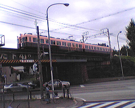 | 7月19日朝.名鉄本線の踏切で電車の通過を待っていた. 目の前を、ピカピカに光る真新しいピンクとチョコレートのツートンカラーの電車が通り過ぎて行った. 夢か幻か、一瞬我が目を疑ったのは、その塗色が遠い昔のnova坊っちゃまの記憶に鮮明に残る色だったから. 今のようにどの電車も山車幕色...じゃなかった、スカーレット一色になる以前の懐かしのオリジナルカラーなのでした.電車は昭和34年登場の最古参5500系. で、慌ててその電車を追いかけたのは言うまでもない. あいにく平行する道路はなかったのだが、何とか数q先のガードに先回りした.と思ったのだが電車はすぐ近くまできており、トランクのカメラを取り出す猶予はない. やむなく車のフロントガラス越しに携帯電話で1枚だけ撮れたのがこの写真. はたして、この電車何だったのだろう....? |