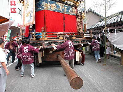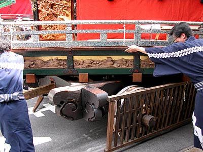 台輪(車輪などの付いた土台)から上が、自由にグルグル回転するようになっていて、町の境まで来て、戻るときにみんなで押して、上だけを反対向きにしてしまうのだ.