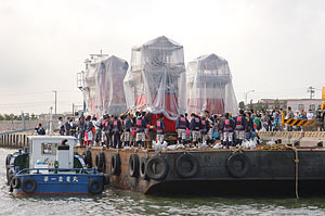 幸い2日目は無事開催され、早朝海から船で会場入りしたのが市内南部の大谷と小鈴谷の山車.工事用台船からクレーンで釣り下げられ上陸する山車が摩訶不思議.